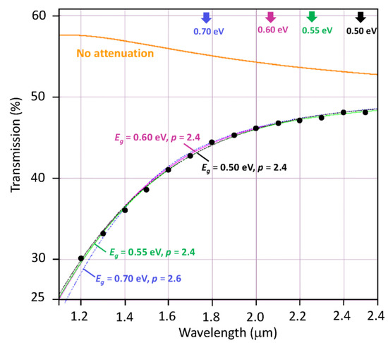 Figure 10 shows the experimental transmittance vs wavelength behavior from 1200 nm to 2500 nm. The colored lines are T values based on Equations (2) and (3) with n ≈ 2.8 [38,39] and s = 3.5. The expected thin film transmittance with no attenuation (α = 0) cannot explain the data, and neither can just purely band-to-band absorption with typical bandgaps of Eg = 0.6 eV [40,41] and 0.7 eV [6,42] with direct and indirect transitions (not shown), which means that there must be some scattering of light in the film and/or on the surfaces to account for the observed T vs λ behavior. Theoretical predictions based on Equations (2) and (3) with Eg = 0.5 eV to 0.7 eV and m = ½ are shown in Figure 10 for the best-fit values of Aa, As, and p given in the figure caption. While Eg = 0.6 eV appears as a perfect fit, Eg = 0.55 eV is also very close. Direct transitions (m = 2) could not be fitted at all. Thus, we can conclude that the observed transmittance is in agreement with an indirect bandgap of 0.55–0.60 eV. The scattering index p is 2.4 but it should be remembered that any surface scattering in the present analysis based on Equations (2) and (3) would artificially inflate the scattering term and modifyp. Similar good fits were found for the other samples (not shown) with values that are close to those of sample A. Table 2 summarizes the best-fit parameters for p and As for all the films with Eg = 0.60 eV and Aa kept the same for all samples; the same absorption coefficient. AsL represents the total effective scattering in the film. No unambiguous correlation could be established with grain size inasmuch as fitting a multivariable function as in the present case will invariably have uncertainties. Nonetheless, we can conclude that the insulating phase possesses an indirect bandgap of 0.60 eV ± 0.05 eV, and the films exhibit significant scattering of light.