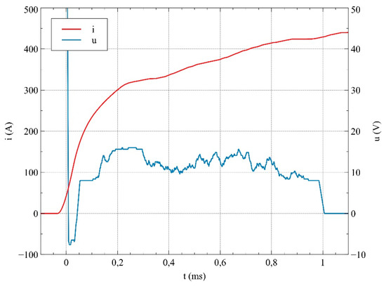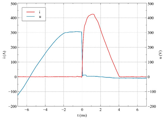 The instantaneous value of the current in circuit may be described using Equation (1). The test circuit has very low induction L, so the power ratio is almost equal to one, that is, φ = 0. The set stand is powered from the public network, so the pulsation ω is equal to 314 rad·s−1 and the load is pure ohmic, that is, ψ = 0. For the two selected cases, when the voltage reached zero and maximum, it can be simplified as follows. For the first case φ = 0 and the exponential part of Equation (1) is equal to zero, the result is presented in Equation (2). For the second case φ = π/2 and the exponential part is also zero, the result is presented in Equation (3).