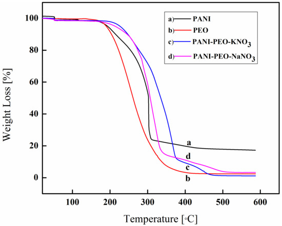 Figure 2b shows that PEO is thermally degraded in a single uniform step. The mass remains stable up to 190 °C. The weight loss starts at 192 °C and shows complete degradation at about 360 °C, which is approximately 92% of the total mass. The remaining 8% is the carbonized form of PEO. Figure 2c,d signify two steps thermal stability of PANI-PEO-KNO3 and PANI-PEO-NaNO3 composites with thermal stability of 350–370 °C, respectively. The onsets as well as the offset decomposition temperature of the composites are higher than PANI counterparts. It is observed from the curves c and d that thermal properties of the composites have been enhanced. The inter-chain interaction between PANI and PEO affects the electron density and bond energy of PANI and hence the net result is the increase in the stability of the composites. Furthermore, the electrovalent type interaction between biphasic PANI-PEO and the inorganic salts may also be a possible cause of the enhanced thermal stability of tri-phase PANI-PEO-salts composites. The thermal stability of the synthesized materials is summarized in Table 1.
