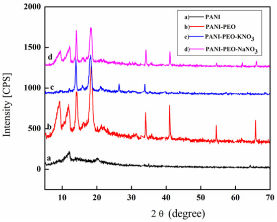 Figure 4a shows the XRD pattern of PANI which represents extensive elevated angle asymmetric peak scattering at 2θ stuck between 12–20°. The respective climax cover one broad peak located around 19.28° equivalents to d-spacing of 3.5256 Å, identifying a small level of crystallinity [25]. XRD patterns of PANI-PEO blend and its composites with KNO3 and NaNO3 salts are shown in Figure 4b–d, respectively. The two distinctive peaks of polymeric blend are found between 2θ 16.1° and 20.3° which are the characteristic peaks of PEO and PANI. The decrease broadness in intensity of the corresponding peaks is observed in case of PANI-PEO blend [26]. This might be due to the disruption of crystalline structure of PEO by PANI. PANI-PEO-KNO3 composite shows further decrease in crystallinity which might be due to greater ionic size of potassium (K+1) causing more dispersion of PANI-PEO chain in the composite. On the other hand Na+ ionic size are much smaller relative to K+, which does not affect the interaction between PANI and PEO chains like potassium. This fact can further be demonstrated by the increased crystallinity of PANI-PEO and PANI-PEO-NaNO3 [27].