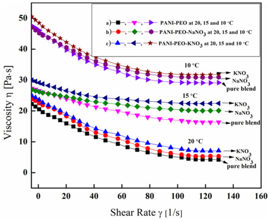 Dependence of viscosity of (a) PANI-PEO pure blend (b) PANI-PEO-NaNO3 (c) PANI-PEO-KNO3 at 20 °C, 15 °C and 10 °C.