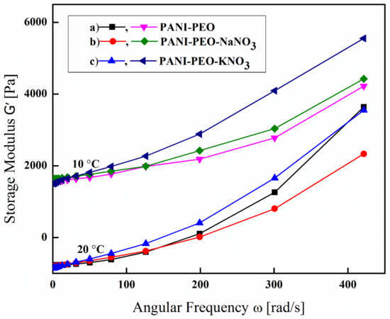 Rheogram of (a) PANI-PEO (b) PANI-PEO-NaNO3 and (c) PANI-PEO-KNO3 indicating dependence of storage modulus on angular frequency at 20 °C, and 10 °C.