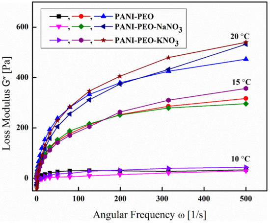 Rheogram of (a) PANI-PEO (b) PANI-PEO-NaNO3 and (c) PANI-PEO-KNO3 showing dependence of loss modulus on angular frequency at 20 °C, 15 °C and 10 °C.
