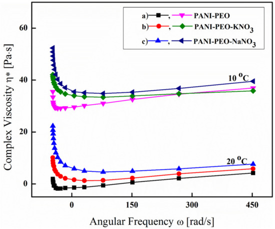 Rheogram of (a) PANI-PEO (b) PANI-PEO-NaNO3 and (c) PANI-PEO-KNO3 depicting dependence of complex viscosity on angular frequency at 10 °C and 20 °C.