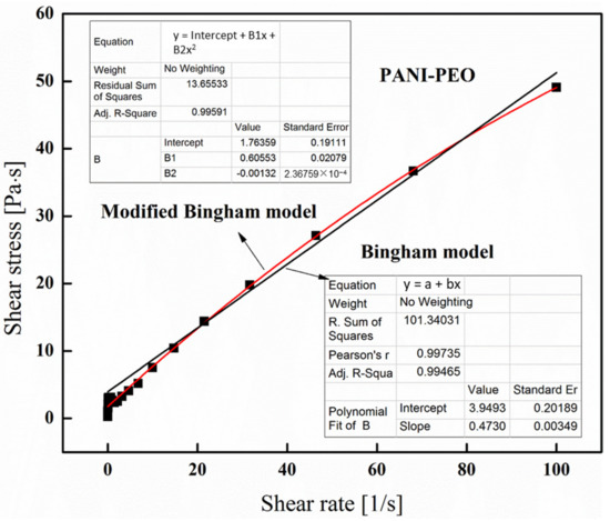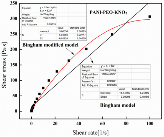 Both Bingham models verified the non-Newtonian and shear thinning behaviors of the samples by mean of its regression coefficient (R2) values for PANI-PEO blend and composites as shown in Figure 11 and Figure 12, respectively. The R2 value further verified that Bingham modified model is best fitted for both blend and composite. PANI-PEO has a stress yield of 3.9493 Pa·s while in case of PANI-PEO-KNO3 the stress yield is 14.44702 Pa·s, affirming that the stress yield of the composite is much higher than pure blend.