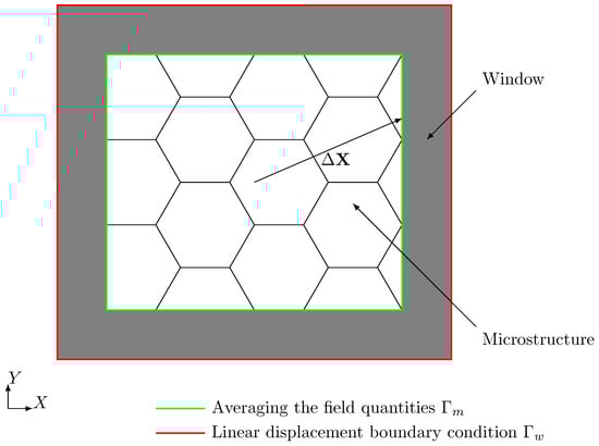This approach is known from analytical homogenization schemes and called the self-consistency method—see []. The window models the surrounding material that a real RVE would be embedded in and reduces the influence of the boundary conditions on the results such that tighter bounds for the effective properties are obtained—see [].