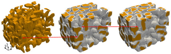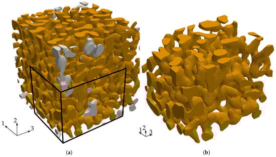The starting point for our investigation of the elastic properties of nanoporous gold with a mean ligament diameter of is a voxel model of a representative sample—see Figure 6a. The data was obtained by 3D focused ion beam-scanning electron microscope (FIB-SEM) tomography undertaken by [,]. The solid fraction of the sample is 32%. For details on the tomography and data analysis in terms of structural and mechanical properties, see [,,]. The model preparation requires only little pre-processing effort. Disconnected regions—made visible by gray color—bear no loads and are removed from the model. In order to detect these isolated regions, we make use of a seed-fill algorithm []. In a second step, we extracted a sub-sample from the full model that is small enough to be analyzed on a computer in a reasonable time and large enough to carry all characteristic information of the microstructure (see Figure 6b).
