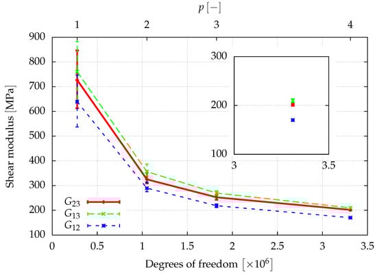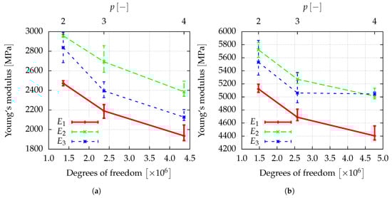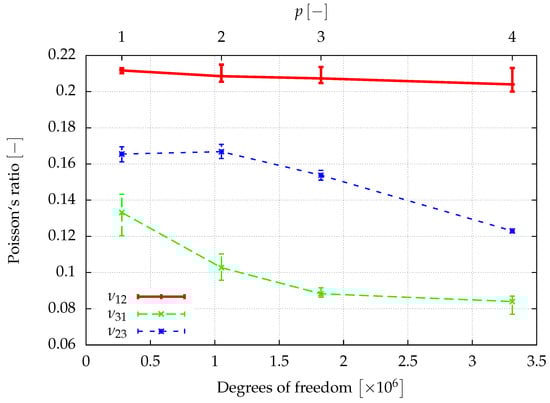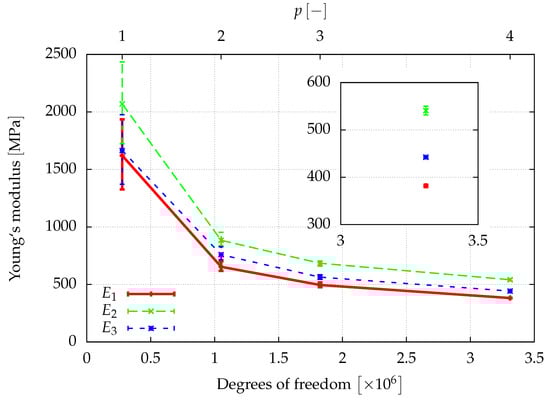 The window method allows for finding the full anisotropic material properties of the sample as explained in Section 3.3. Assuming an orthotropic material behavior, the directional Young’s moduli, , the shear moduli, , and the Poisson ratios , can be determined from a least squares fit of the obtained elasticity matrix. The results of a first investigation of the elastic properties are given in Figure 8, Figure 9 and Figure 10, where the convergence of the elastic parameters against the degrees of freedom for a uniform increase of the polynomial degree of the shape functions of all cells is plotted. The error-bars include the results obtained for different sizes of the window. With an increasing spatial resolution, the differences in the results obtained for different window sizes are more or less reduced and will be neglected in the further considerations. In summary, the obtained results are in the same range of the data already presented in [] for a sample of the same size.