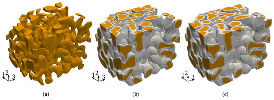 (a) sub-sample of a size of ; (b,c) depict the sub-sample after applying a coating of , resp. to the voxel model which corresponds due to the not equal voxel spacing to a coating thickness between , resp. .