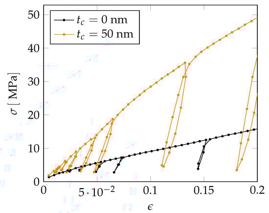 In a next step, we extend our investigations to the nonlinear regime by also considering the plastic behavior of the NPG-PPy nanocomposite. In order to relate the computations to experiments, we consider experimentally obtained true stress–strain curves on nanoporous gold samples with a ligament diameter of and NPG samples coated by a PPy layer with a thickness of —see Figure 15. An important assumption that allows us to apply the tomography data of a NPG sample with to a smaller ligament diameter is the self-similarity of the NPG which holds for structures with a ligament diameter . The self-similarity of NPG has been intensively investigated for a large range of ligament sizes in [,].