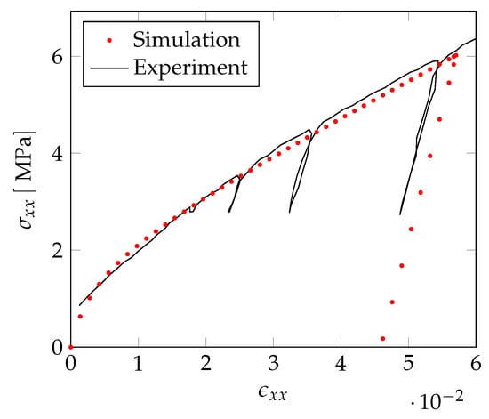 Comparison of the numerically obtained stress–strain curve with experiments using bulk material parameters.