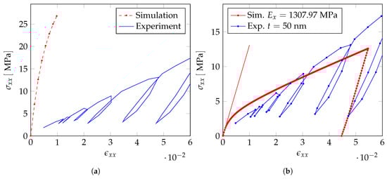 (a) Comparison of the experimentally obtained stress–strain curve with the numerical stress strain curve using the adjusted material parameter of gold and epoxy material properties for the polymer coating as starting values for fitting procedure and (b) numerical and experimental stress–strain curve after adjusting the material parameters of the polymer.