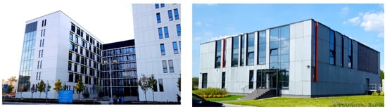 Fibre-cement boards have been used in construction since the beginning of the last century. Their inventor was the Czech engineer Ludwik Hatschek, who developed and patented the technology of producing fibre cement, then called “Eternit”. The material was strong, durable, lightweight, moisture-resistant, freeze–thaw resistant and non-combustible [1]. Fibre cement became one of the most popular roofing materials in the world in the 20th century. This was so until one of its components (i.e., asbestos) was found to be carcinogenic. In the 1990s, asbestos was replaced with environment-friendly fibres, mainly cellulose fibres. The fibre-cement boards produced today are made up of cement, cellulose fibres, synthetic fibres and various additives and admixtures. They are a completely different building product than the original one [2], and still require investigation and improvement. The additional components and fillers of fibre-cement boards are lime powder, mica, perlite, kaolin, microspheres and recycled materials [3,4], whereby fibre-cement boards can be regarded as an innovative product which fits into the sustainable development strategy. At present, such boards are used in construction mainly as ventilated façade cladding [5], as illustrated in Figure 1. In the course of their service life, fibre-cement boards are exposed to various factors, such as chemical (acid rains) and physical aggressiveness (ultraviolet radiation), but mainly to variable environmental impacts, including sub-zero temperatures in the winter season.