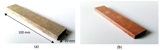 The freeze–thaw cycling of the specimens was conducted as follows. First the specimens were cooled (frozen) at a temperature of −20 ± 4 °C in a freezer for 1–2 h and kept at this temperature for the next hour. The specimens were heated (thawed) in a water bath at a temperature of 20 ± 4 °C for 1–2 h and kept at this temperature for the next hour. One should note that the above temperatures apply to the conducting medium (i.e., air or water). Each freeze–thaw cycle lasted on average about 5–6 h. Air-dry reference specimens (not subjected to freeze–thaw cycling) were denoted as AR and BR. The denotations of exemplary series of boards are presented in Table 2. Figure 2 shows exemplary views of the tested (20 × 100 mm and 8 mm thick) specimens.