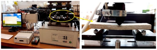 In order to determine the effect of freeze–thaw cycling on the fibre-cement boards, the latter were subjected to three-point bending and investigated using the acoustic emission method. Breaking force F, strain ε and AE signals were registered in the course of the three-point bending. Figure 3 shows the three-point bending test stand and the acoustic emission measuring equipment.