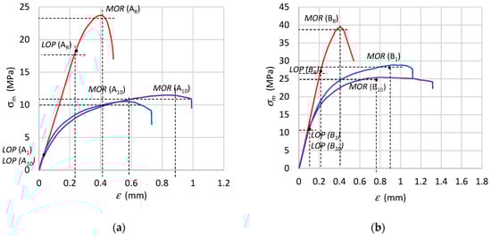 Bending σ–ε relation for specimens of fibre-cement boards: (a) series A, (b) series B. LOP: limit of proportionality; MOR: modulus of rupture.