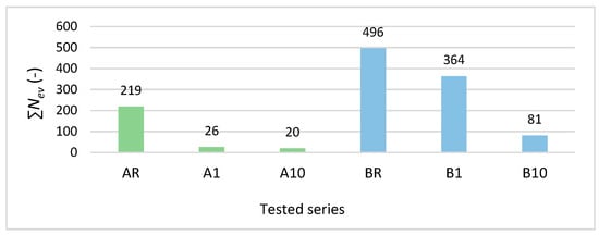 The next step in this research on degrading changes in the structure of fibre-cement boards exposed to freeze–thaw cycling was an analysis of the AE signals registered in the course of the three-point bending test. The analysis was based on AE descriptors such as: events rate Nev, events sum ∑Nev and events energy Eev, and on the signal frequency distribution. Figure 5 shows exemplary values of events sum ∑Nev registered for the boards of series AR–A10 and BR–B10.
