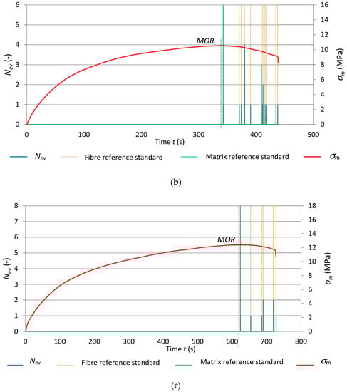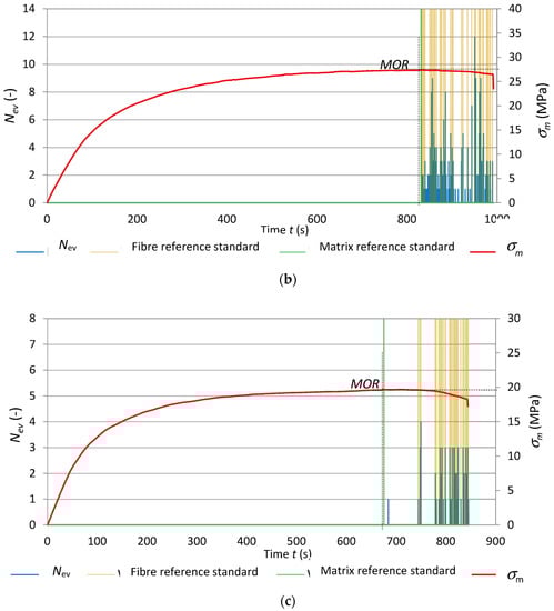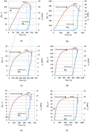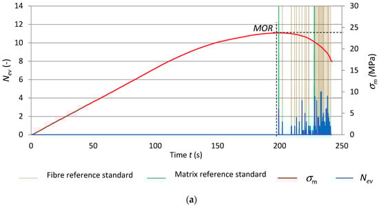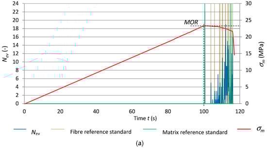 For a more precise analysis of the failure of the boards under bending and the effect of freeze–thaw cycling, events sum ∑Nev and flexural stress σm versus time for selected cases are shown in Figure 6.
