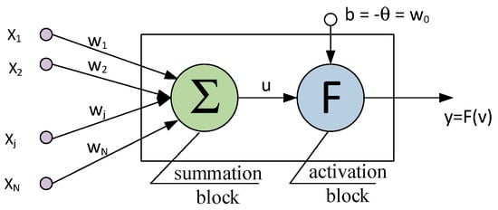 The cement matrix, fibre and background reference standards were implemented in an artificial neural network, and the training and testing of the latter began. A unidirectional multilayer backpropagation structure with momentum was adopted for the ANN. A model of the artificial neuron is shown in Figure 8. The model includes N inputs, one output, a summation block and an activation block.