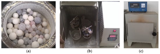 Planetary high energy ball milling setup. (a) Ball mill jar, (b) Planetary high energy ball mill, and (c) Muffle furnace.