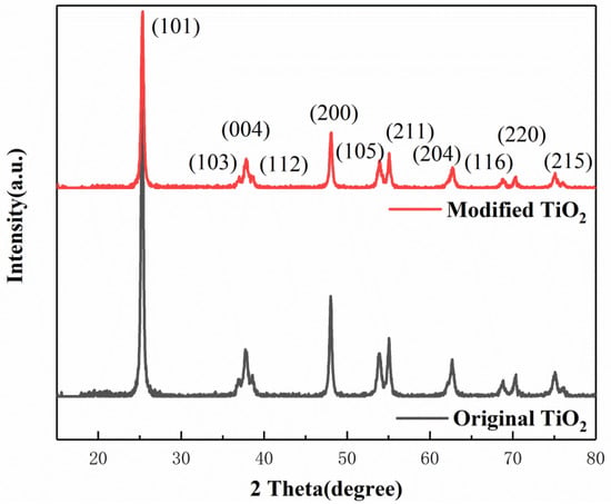 On the basis of these data, the average crystal sizes were calculated according to Scherrer’s equation [31]. For the original and modified TiO2, the results were 21.16 nm and 20.78 nm, respectively. It demonstrates that ball milling favors the formation of small crystallites, leading to more intense diffraction peaks, with the decrease of (101) crystal facet. In summary, it can be concluded that the planetary high energy ball mill can dope Fe3+ ions into nano-TiO2, making it successfully modified.