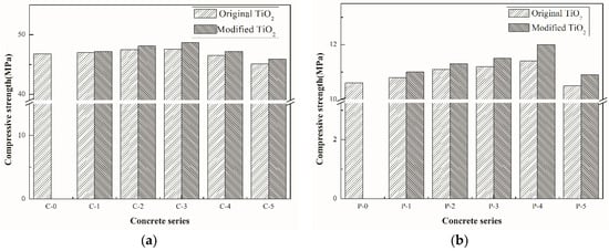 The compressive strength test was conducted to ensure that the incorporation of nano-TiO2 did not compromise the mechanical performance of concrete, as shown in Figure 7. It can be seen from the figure that the compressive strength of two types of concrete both increased firstly and then reduced with the continuous increment of nano-TiO2 content. It indicates that the incorporation of nano-TiO2 is beneficial to the improvement of concrete strength, which is mainly due to the micro-filling effect of nano-TiO2, making the internal structure of concrete more compact and leading to the improvement of strength. The maximum increase in strength is about 3% and 5%, respectively. As the particle size of modified TiO2 is smaller than that of the original TiO2, the strength of modified TiO2 concrete is higher than that of the original TiO2 concrete with the same content of TiO2. In addition, the incorporation of Fe3+ can motivate the formation of iron-containing hydration products [32,33], which makes the internal structure more compact, and therefore improves the strength.