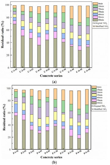 The residual rate of NO concentration after different periods of photocatalysis was calculated and displayed in Figure 8. It should be pointed out that the NO concentration results of concrete samples without TiO2 almost stayed constant. Thus, these results were not depicted in Figure 8. As it shows, the degradation rate of all the samples increases with the extension of irradiation time. Overall, the degradation rate of samples with modified nano-TiO2 was much higher than that of the original nano-TiO2 samples. The reason can be partially attributed to the smaller particle size that causes more contact area with pollutants. Also, the doped Fe3+ in the crystal of TiO2, by the mechanical chemistry theory of ball milling as mentioned above, can act as an acceptor which can trap photogenerated charges and reduce the metal ion species into a lower oxidation state. Then, due to the close energy level of the Ti4+/Ti3+ couple, the transformation of Ti4+ into Ti3+ is accelerated, which has been reported to improve the photodegradation by acting as a hole trap [15,34]. Another point is that Fe3+ dopant, which has been reported to be effective to the batho-chromic shift, promotes a possible extension of the activity of TiO2 towards visible light range [35,36]. Therefore, the photocatalytic activities of TiO2 are enhanced significantly.