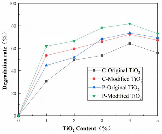 For further comparison, the photocatalytic degradation rates of all the samples at 60 min are shown in Figure 9. At the same content of nano materials, the degradation rate of concretes with modified nano-TiO2 is about 13% to 20% higher than that with original nano-TiO2. At the same time, the photocatalytic degradation rate of porous cement concrete is better than that of common cement concrete, which is because of the greater contact area with light caused by the connected pores of porous concrete. In the case of photocatalytic property, the optimized content of TiO2 is suggested to be 4%.