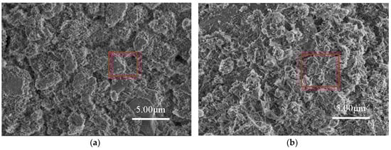 The microstructural test of C-0 and C-4 are shown in Figure 10. It can be seen from Figure 10 that the internal structure of C-0 concrete is looser, and the cracks or pores can be clearly seen between the hydration products. C-4 concrete is relatively dense inside, and agglomerated particulate matters are filled between the hydration products. In order to further confirm the composition of the material, the two samples were analyzed by EDS. The results are shown in Figure 11. It can be seen from Figure 11 that the main elements in C-0 are calcium, silicon, and oxygen, whereas for C-4, calcium, silicon, and oxygen elements, as well as a lot of titanium. It indicates that the inner structure of C-4 has titanium-containing substances except common hydration products, which is TiO2. Therefore, based on the above analysis, it can be seen that the introduction of modified nano-TiO2 can be filled in the cracks or pores between the hydration, so that the structural density increased, which in turn improves the strength of C-4.