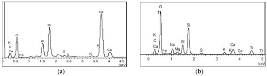 The effect of the planetary high energy ball milling treatment on the catalyst morphology and crystal structure was investigated by SEM and XRD tests, prior to preparing concrete samples. The SEM results are shown in Figure 4 and its energy spectrum is shown in Figure 5. It can be seen from Figure 4 that the amorphous nanoparticles were distributed unevenly and there were obvious agglomerations in both samples. However, the TiO2 particles were more prone to agglomeration after ball milling, which can be partially attributed to the reduction of particle sizes, as well as the high surface energy that was caused by ball milling. Therefore, the modified TiO2 appears to be more amorphous and finer, providing more surface area for the activation of photocatalytic activity. The EDS spectrum verifies that the ball milling procedure successfully introduces iron into TiO2 while the spectrum of original TiO2 has no iron.