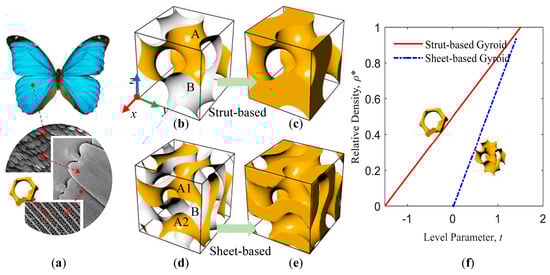 (a) Gyroid structure derived from bionic butterfly wings; gyroid surface (b) close to be strut-based gyroid structure (c) and double gyroid surface (d) close to be sheet-based gyroid structure (e); (f) is the relationship between relative density and parameter t of the two types gyroid cellular structures.