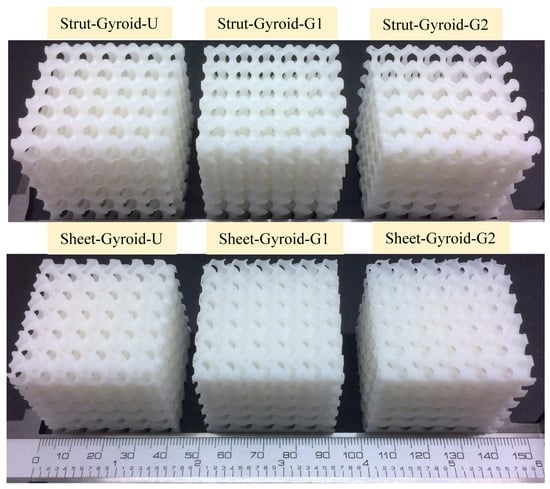 In this work, six sets of models are designed for strut-based and sheet-based gyroid cellular structure for experimental analysis. The design area is a cubic area of 36 × 36 × 36 mm, and the size of the cellular unit is set as 6 × 6 × 6 mm. Their average volume fraction is 0.3, with the uniform structure with a volume fraction of 0.3, the gyroid cellular structure that linearly changes the density from 0.2 to 0.4, called gradient-1, and the gyroid cellular structure that linearly changes the density from 0.1 to 0.5, called gradient-2. As shown in Figure 3, the cellular structures with smooth and continuously varying densities can be obtained, and the corresponding nomenclature of these cellular structures can be found in the figure.