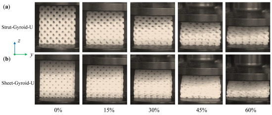 Deformation stages of Strut-Gyroid-U (a) and Sheet-Gyroid-U; (b) cellular structures in the presence of 0%, 15%, 30%, 45%, and 60% compression strain from the video capture.