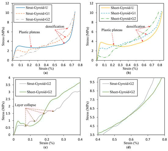 Compressive stress-strain curves of strut-based (a,c) and sheet-based (b,d) gyroid with different gradient.