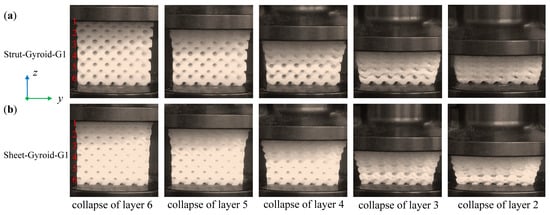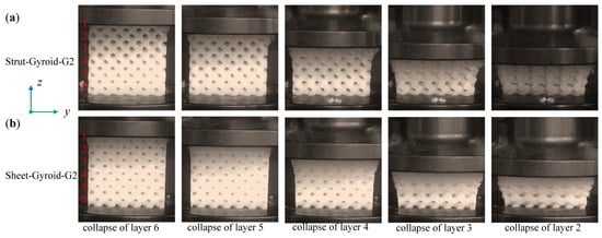 Deformation stages of layer-by-layer collapses of Strut-Gyroid-G1 (a) and Sheet-Gyroid-G1 (b) cellular structures from the video frames.