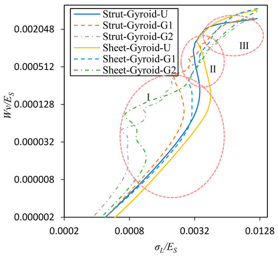 On the other hand, in Figure 11 is demonstrated the relationship between Wv and σL, and they are normalized by the modulus of the base material, ES. This expression is useful in allowing a designer to select a cellular structure that minimizes the stress while the required energy is absorbed [27]. We divide the curve in Figure 11 into three regions, I, II, and III. First, the region I corresponds to the elastic deformation region of the uniform structure and the collapse deformation region of the low-density region of the graded structure. In this area, they all absorb less total energy. Second, in region II, the uniform structure starts to be plastically deformed, so that the absorbed energy sharply increases, and the stress increases less. However, the graded structure absorbs energy at a lower rate in this region. Third, the uniform structure enters the densified state in the III region, and a significant turning point and a subsequent rapid increase in the stress appear in the curves. In contrast, the strut-based and sheet-based gyroid structures with gradient-2 do not show a significant turning point, but gradually enters the densification state, and the rate of energy absorption generally remains unchanged. For the gradient-1 structures, there is a slight turning point, but the Strut-Gyroid-G1 is relatively more obvious than the Sheet-Gyroid-G1. Furthermore, according to the features described above, the sheet-based gyroid structure has a more gradual energy absorption process than the strut-based gyroid structure, and there is no point of sharp turning.