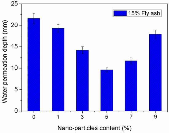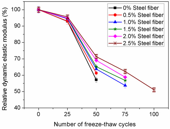 - Incorporation of the correct amount of steel fibers improved the carbonation resistance of the concrete containing nano-SiO2; however, an excessive fraction of steel fiber would reduce the carbonization resistance of the specimens. In addition, the addition of steel fiber reduced the permeability resistance of the composite reinforced by nano-SiO2. Reinforcement of steel fibers enhanced the freezing-thawing and cracking resistance of concrete incorporating nano-SiO2. By increasing steel fiber volume content, the freeze-thaw resistance of concrete incorporating nano-particles exhibited an increasing trend, and the cracking resistance of the concrete decreased gradually.