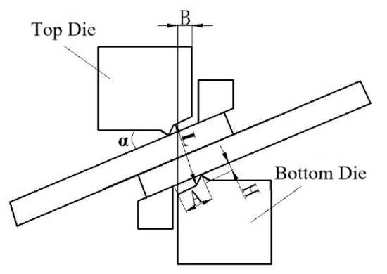 At present, shear connection technology is mainly applied to the connection of intermediate sheet in endless rolling. A new solid-state connection technology based on the plastic deformation connection process, which was applied to the endless rolling intermediate blank shear connection process, was developed by Posco (Pohang) and Hitachi (Hitachi) Co. Ltd. [8,9,10,11,12]. Relevant papers and reports show that the company mainly studies the connection technology and equipment, and obtains the minimum temperature of effective connection of sheet metal is 980 °C and the thickness of blank is 29–120 mm. The effects of process parameters such as overlap (B), the tilt angle of the sheet (α) and pressure amount (L) and material parameters such as carbon content and oxide content on the interface closure of the joint in Figure 1 are analyzed [12,13,14]. The strength of the connection is proved. Researchers at Hebei University of Science and Technology carried out basic research on the rapid shear connection technology of endless rolling intermediate blanks, and designed the dynamic and static connection mechanism [15,16], which is a relatively simple six-bar and one-slide mechanism, and derived the motion function. Optimization of this mechanism is employed using a genetic algorithm (GA) and the optimization parameters of this mechanism are obtained; the kinematics analysis show that the connection time is less than 0.1 s and the connection thickness is more than 80% of the thickness of the solid-state metal. The change of material structure in the joint zone was analyzed, the dynamic recrystallization is the main driving force for grain refinement is concluded, and the greater the pressure amount, the more intense the dynamic recrystallization and the higher the grain refinement degree. Interfacial bonding is formed by three-stage theory, the increase of the pressure amount, the narrowing of the bonding band, the decrease of voids, the gradual disappearance of the interface and a large number of common grains are formed [17]. The key parameters affecting the rapid shear-extrusion bonding of metals are determined as follows: the overlap (B), the pressure amount (L), the width of the shear edge (A) and the tilt angle of the shear edge (a). Among them, the overlap ranges from 3 mm to 15 mm, the pressure amount ranges from 0.5 to 1.5 times the material thickness, the width of the shear edge from 20 mm to 40 mm, and the tilt angle of the shear edge from 12° to 14° [18,19].