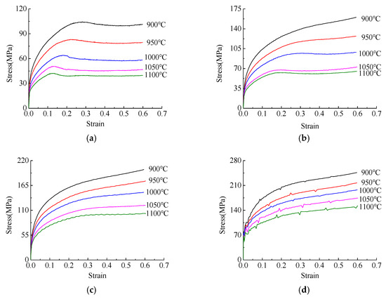 The specific process flow chart is shown in Figure 2. The compression tests are implemented on a Gleeble-3800 thermal simulation machine at different deformation temperatures of 900, 950, 1000, 1050 and 1100 °C, with strain rates of 0.01, 0.1, 1.0 and 10 s−1. The specimen size is 10 mm in diameter and 15 mm in height. Each surface of the specimen is covered with the tantalum foil to minimize friction. The specimens are initially heated to the deformation temperature and then held for 5 min to homogenize the temperature. The true strain reached to 0.6. After the compression test, the compressed specimen is quickly quenched into cold water to keep the microstructure. The quenched specimens are sliced along the axial section, and then polished and etched with a saturation picric for the observation of austenite grain boundaries. Based on the isothermal compression tests, the true stress–strain curves of Q345 steel are plotted, as shown in Figure 3 [21,22]. The deformation behavior of Q345 steel is coincident with the typical rules of low-carbon steel.