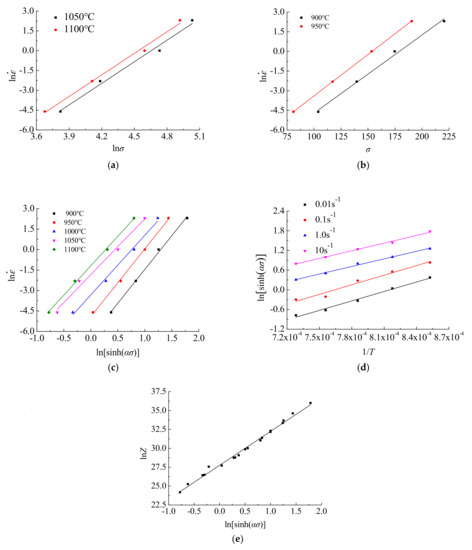 The mathematical derivation of Equations (1) and (2) is performed. According to the experimental results of true stress-strain data and by linear regression of , , , and , the relevant parameters in the flow stress model with ε = 0.3 are obtained as follows: n1 = 5.4488, β = 0.0163, α = 0.0113, n = 4.5368, Q = 328645.0625, A = 1.13251012. The linear fitting of correlation coefficients is shown in Figure 4.