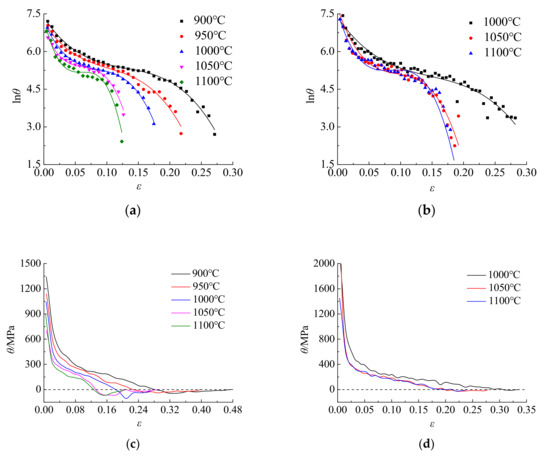 Critical strain and peak strain solution curve: (a) Inθ-ε ( = 0.01 s−1); (b) Inθ-ε ( = 0.1 s−1); (c) Inθ-ε ( = 0.01 s−1); (d) Inθ-ε ( = 0.1 s−1).