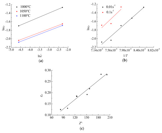Material constant linear regression solution: (a) Inεp-In ; (b) Inεp-1/T; (c) εp-Zm1.
