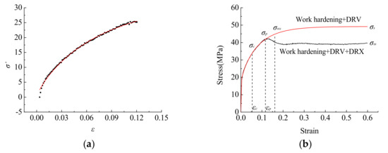 According to the experimental true stress–strain data, the nonlinear data fitting of Equation (12) is obtained, and it is obtained that: a4 = 48.6483, b = 6.4622, c = 0.4164. Figure 7 shows the dynamic recovery and dynamic recrystallization curves.