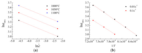 Linear regression results of dynamic recrystallization equation: (a) lnεp-ln ; (b) lnεp-1/T.