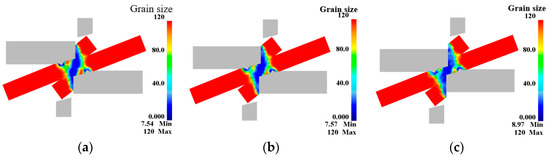 Dynamic recrystallized grain size: (a) L = 100%; (b) L = 125%; (c) L = 150%.