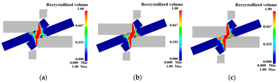 Dynamic recrystallization volume percentage: (a) L = 100%; (b) L = 125%; (c) L = 150%.