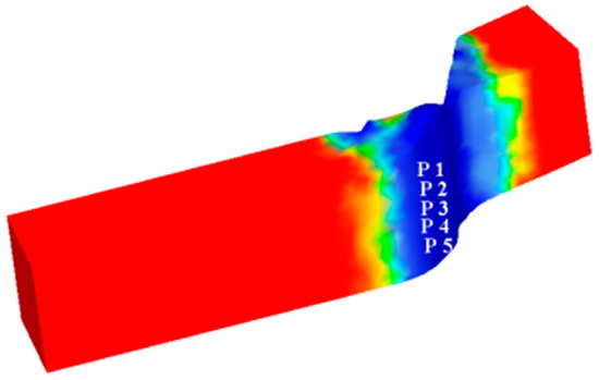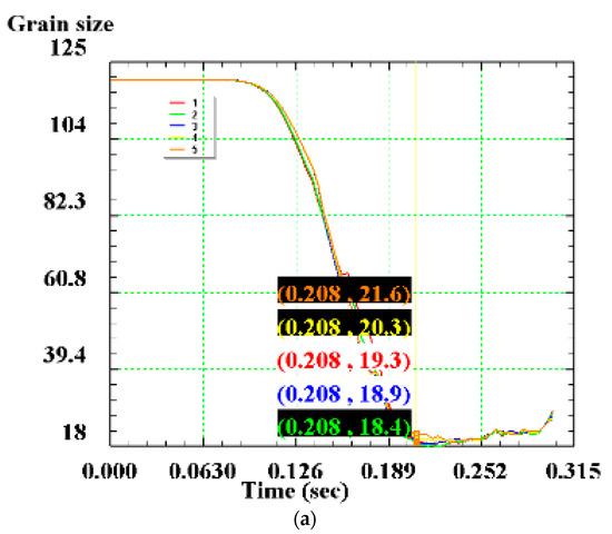 The point tracking method is used and five tracking points are taken near the blank connection surface in the direction perpendicular to the width of the blank, as shown in Figure 13. The changes of dynamic recrystallized grain size and volume percentage during the shear connection of the five tracking points are acquired.