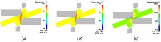Development of Deform-3D (Version: Deform6.01) Software Developed by SFTC Company in USA (Santa Fe, NM, USA), and the established Arrhenius constitutive equation and dynamic recrystallization model are placed into the user subroutine. The core codes of user subroutines are written in FORTRAN language and stored in Deform-3D V6_0 User Routine def_usr. In this paper, the constructed constitutive model and dynamic recrystallization model are embedded in the DEF_SIM folder of Deform. The grain size and volume percentage of dynamic recrystallization can be obtained by simulating the shear connection process. The effects of different shear connection conditions on the structure evolution, especially the dynamic recrystallization process, were discussed, and the appropriate shear connection parameters were found. The simulated shear connection process is shown in Figure 9. The upper crop shear is descending, and the shear edge contacts the blank to plastically deform the blank. Then the edge bites into the blank, and the blank undergoes severe deformation under the action of the cutting edge to achieve a quick shear connection. The degree of shear connection is characterized by the pressure amount L, the expression of which is shown in Equation (18).