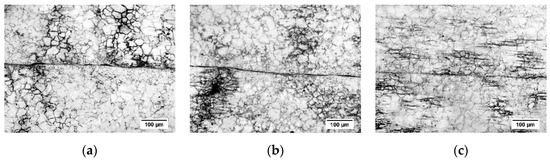 In this experiment, a 315 t hydraulic press was used and the shear connection experiment is carried out under the physical simulation experimental conditions. The microscopic state under different pressure amounts is analyzed to verify the accuracy of the model. Figure 17 shows the microstructure of the large deformation area when the pressure amount is 100%, 125% and 150%, respectively. With the increase of the pressure amount, the grain size is refined remarkably, which is consistent with the simulation trend. This is because of the early stage of the shear connection process, the plastic deformation process at high temperature causes dynamic recrystallization of grains, severe shear and friction of overlapped sheets, and energy input to the sheets, which further increases the energy. With the shear deformation process, oxide scales and other impurities continue to break up, forming fine particles, which provides a nucleation site for dynamic recrystallization. Therefore, the grain size is refined continuously during shear connection. After the pressure amount reaches 100%, the grain size increases slightly. The reason for this might be that part of the distortion energy inside the grain is converted into heat (see Figure 16), and the remaining distortion energy is insufficient to maintain the formation of new fine grains of recrystallization. At this time, driven by temperature, atoms diffuse and grains grow relatively.