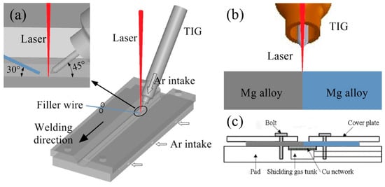 The distance between the head of the TIG torch and the workpiece surface was 1.5 mm, and the distance between the TIG torch head and the axis of the laser beam was 1 mm. A schematic diagram of the Mg alloy welding process is shown in Figure 1.
